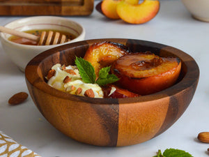 5. Serve the peaches with some of mascarpone cream, chopped almond and a bit of honey.