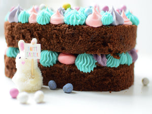 - Pipe swirls and peaks in different colours all over the surface of one of the chocolate cakes, then place the other cake on top and repeat so the cake looks like a colourful Easter egg when viewed from above. Sprinkle with egg-shaped Easter treats and serve!