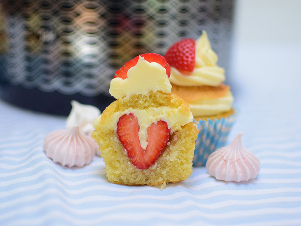 11. Transfer the buttercream to the piping bag and pipe a flat spiral or swirl shape over the top of each cupcake, covering the strawberry entirely. Then reach for the cut-off sponge 'hat', place it on top and pipe a small, this time 'peaked', swirl on top decorated with a quartered strawberry on top.