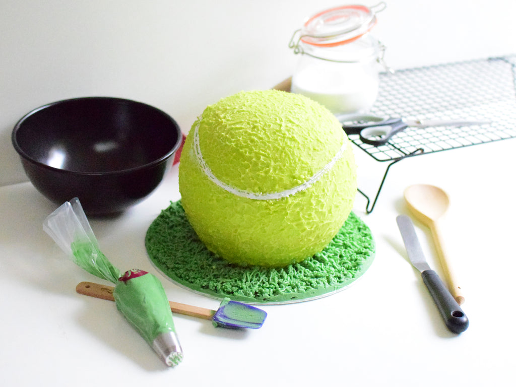 - When you have finished, chill for ten minutes or so. Then use a kebab stick to draw the signature tennis ball lines on the surface of the cake.