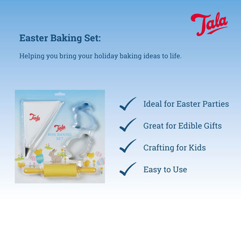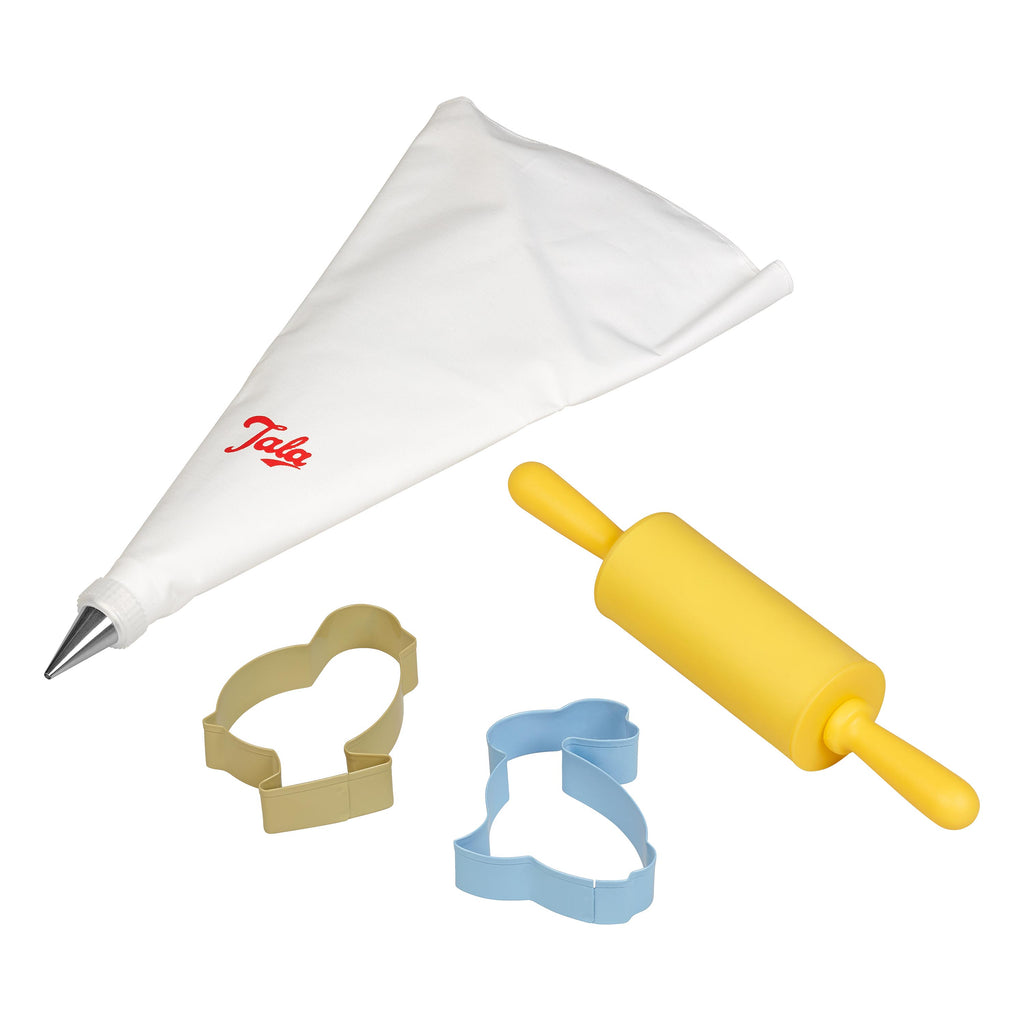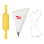 Get into the Easter spirit with the Tala Easter Baking Set! This delightful set includes everything you need for fun seasonal baking—an icing bag with a stainless steel writer nozzle for decorating a pistachio chick and pink bunny cookie cutter for perfect Easter shapes and a yellow mini rolling pin to help you roll out dough with ease.