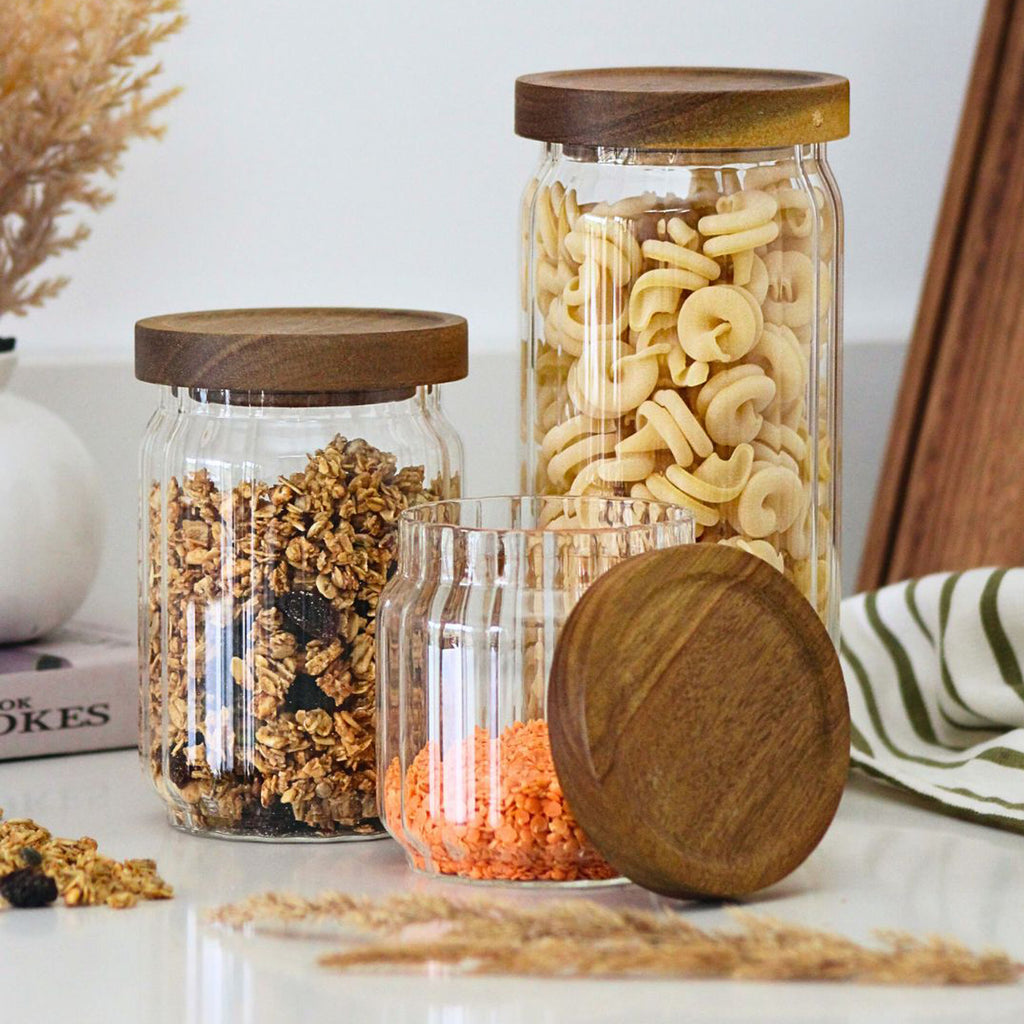 Add style and order to your kitchen with the Tala Ribbed Glass Jars with Acacia Lids, where timeless design meets practical storage. These beautifully crafted jars are made from durable ribbed glass, ideal for displaying and storing your pantry staples, while the natural acacia wood lids bring a touch of organic warmth to your countertop.