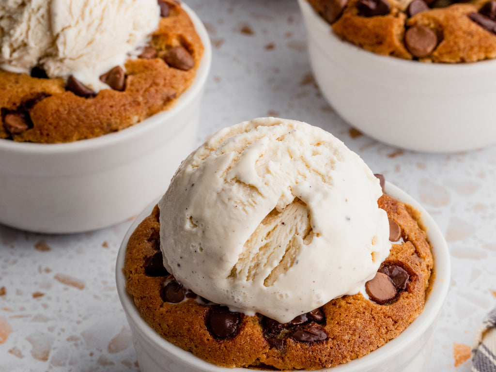 - Divide the mixture between 4 ramekins and smooth out using an offset spatula. Sprinkle the leftover chocolate chips on top of each ramekin.