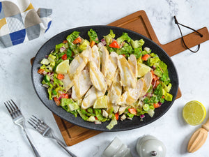 4. Place the salad onto a large serving plate. Add the chicken and drizzle with a little more dressing (optional).