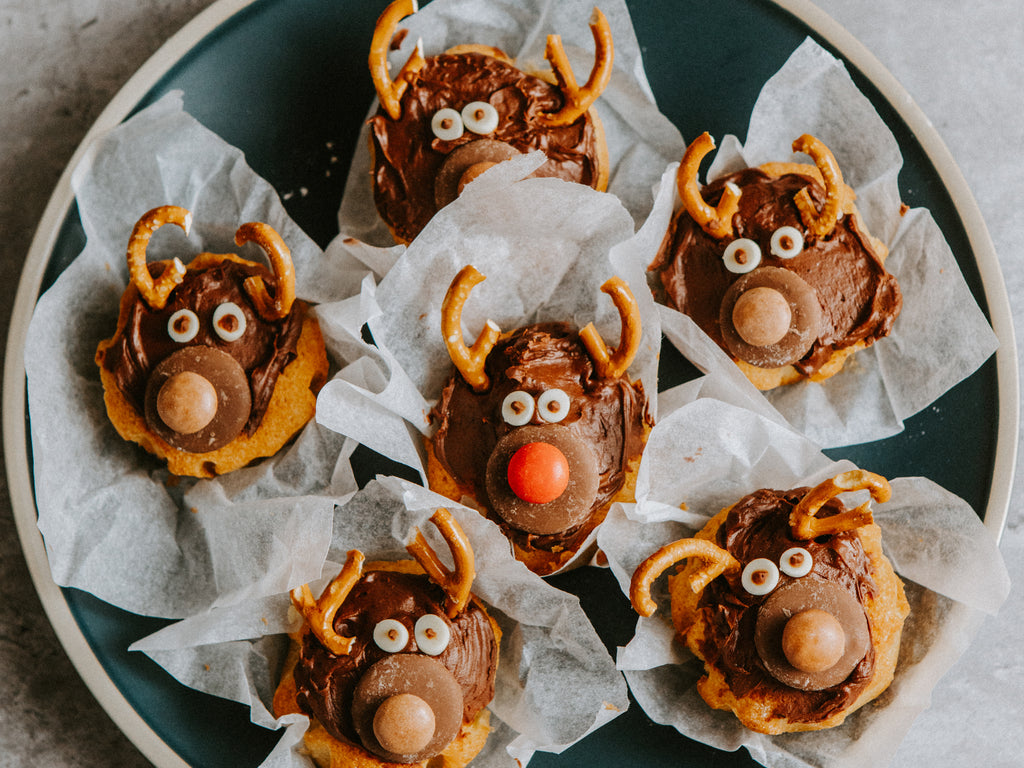 - Add some chocolate buttercream to the cupcake, position a milk chocolate button on top of each cake, then 2 white chocolate chips above it. Use a little icing as glue to stick a red or brown Smartie onto the milk chocolate button for a nose. Then use your icing bag to draw dots of chocolate buttercream onto the white chocolate chips for eyes. Stick 2 pretzel top halves into the top of each cake for antlers.