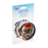 Made of stainless steel thesepastry cutters are perfect for making mince pies tarts and mini-quiches.ÊUse our pastry cutters to cut into pastry sugarpastecookies and biscuits. They are ideal for creating freshly made personalisedbaked goods. Handwashing is recommended to keep your cutters in pristinecondition. They come in a set of 3 different sizes.