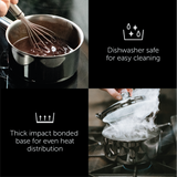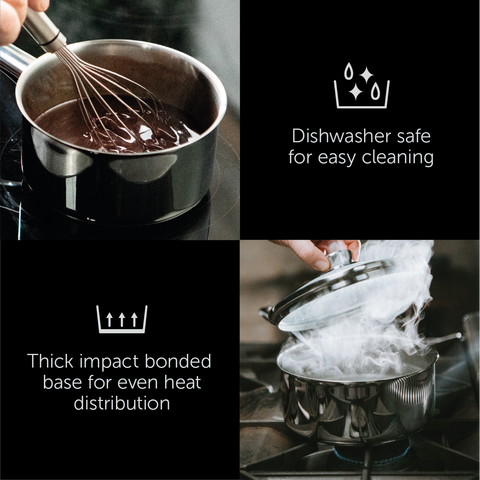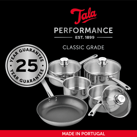 Our Tala Performance high quality mirror polished 18/10 stainless-steel 5-piece saucepan set includes a 16cm saucepan 18cm saucepan and 20cm saucepan with glass lids 14cm milk pan and 24cm fry pan. Manufactured in Portugal with a 25-year guarantee. The base is laser marked indicating the pans can all be used on all hob types including induction. The thick impact bonded base provides even heat distribution ensuring food cooks evenly and retains heat meaning cooking can be more energy efficient.